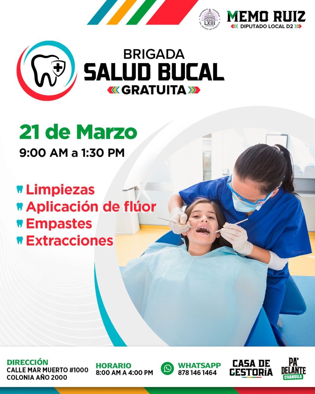 Como parte de los compromisos adquiridos con la ciudadanía, el Diputado Local del Distrito 2, Guillermo “Memo” Ruíz, pone en marcha la Brigada de Salud Bucal, que dará inicio el próximo 21 de marzo en la Casa de Gestión ubicada en calle Mar Muerto #1000, Colonia Año 2000, con un horario de 9 de la mañana a 1:30 de la tarde, con el objetivo de brindar acceso a servicios de salud bucal gratuitas, promoviendo el bienestar de la comunidad.