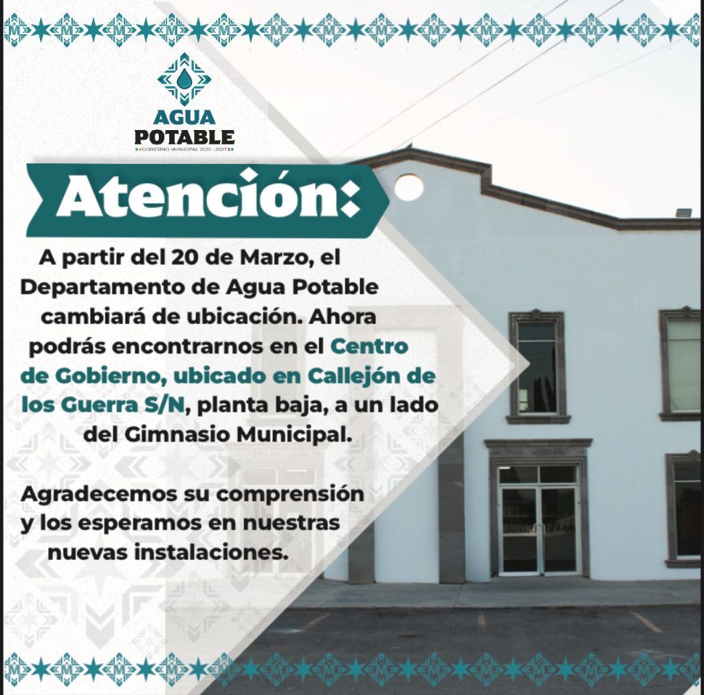 La Administración 2025-2027 de Melchor Múzquiz liberada por Laura Jiménez Gutiérrez informa a la ciudadanía que, con el objetivo de mejorar el servicio y la atención al público, el Departamento de Agua Potable y Alcantarillado cambiará de ubicación a partir del 20 de marzo.