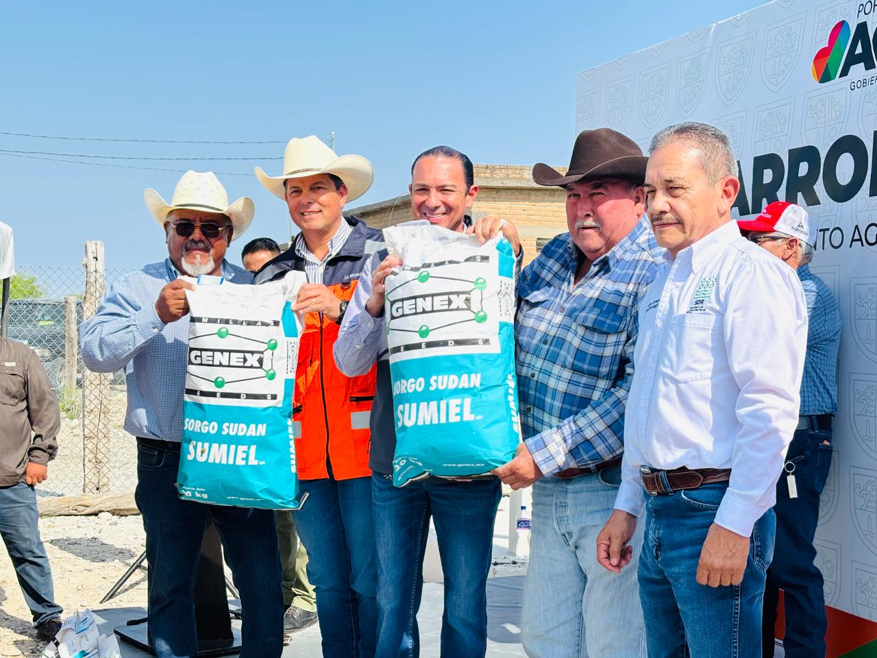 Con la entrega de 18 mil kilogramos de semilla de sorgo forrajero, es una aportación tripartita: el Estado aportó el 25%, el municipio otro 25% y el productor el 50% restante.