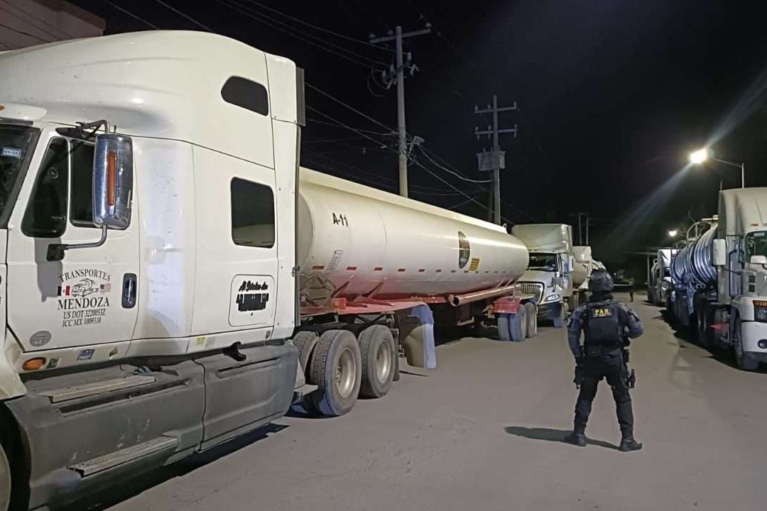 Policía Estatal de Coahuila durante su servicio de prevención, patrullaje y vigilancia en los límites con Nuevo León en el municipio de Hidalgo aseguró sobre la carretera federal No.2 Nuevo Laredo – Piedras Negras 5 tractocamiones con sus remolques que transportaban hidrocarburo, del cual no pudieron acreditar su procedencia.