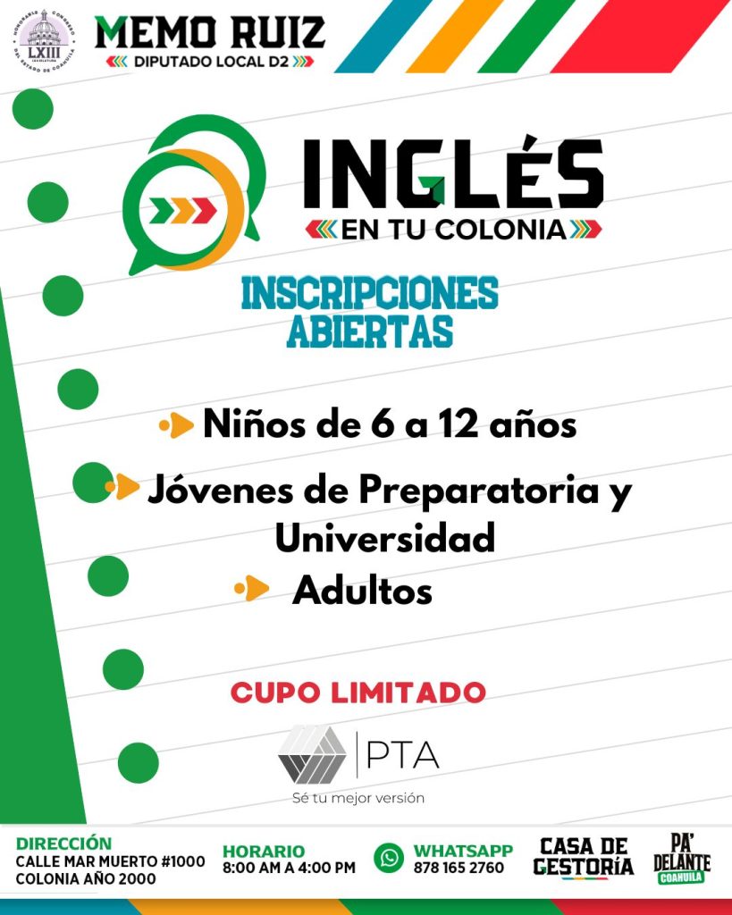 El próximo lunes 28 de abril, el Diputado Local por el Distrito II, Guillermo Ruiz, dará inicio a los primeros dos grupos del programa “Inglés en tu Colonia”, una iniciativa gratuita dirigida a niños, jóvenes y adultos de la comunidad, este programa busca beneficiar principalmente al sector que abarca las colonias Acoros, Año 2000, Villas del Carmen, Cumbres y la parte alta de nuestra ciudad.