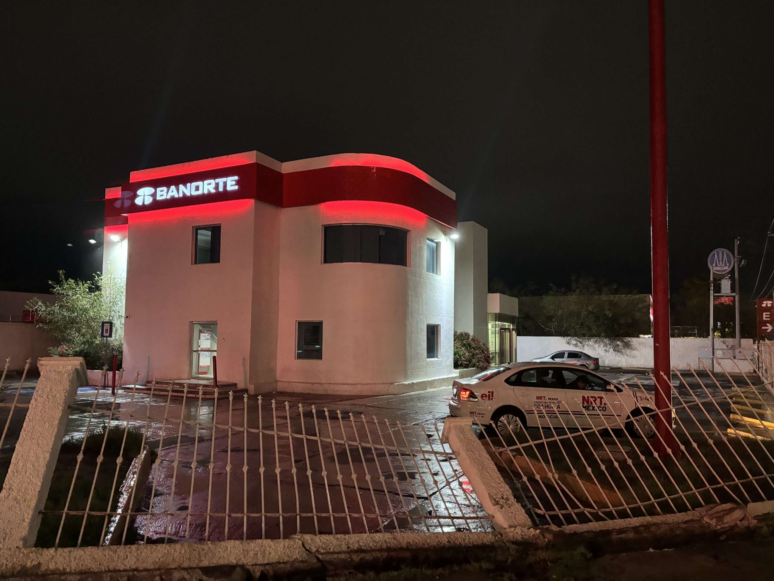 El incidente se registró cerca de las 19:30 horas, antes de que las autoridades arribaran. El choque contra objeto fijo generó daños considerables en la estructura del banco.