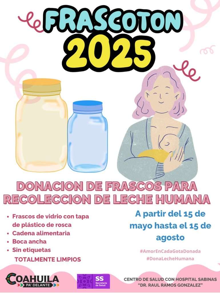 El Centro de Salud con Hospital Sabinas “Dr. Raúl Ramos González” dio inicio a la jornada Frascotón 2025, una campaña solidaria destinada a la donación de frascos de vidrio para la recolección de leche humana, así lo informó el director del nosocomio, Dr. Francisco Iribarren Cárdenas.