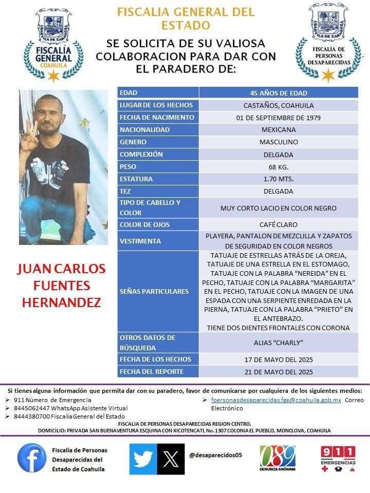 La Fiscalía de Personas Desaparecidas en la Región Centro de Coahuila solicitó el apoyo de la ciudadanía para localizar a Juan Carlos Fuentes Hernández, de 45 años, quien fue reportado como desaparecido en el municipio de Castaños desde el pasado 17 de mayo.