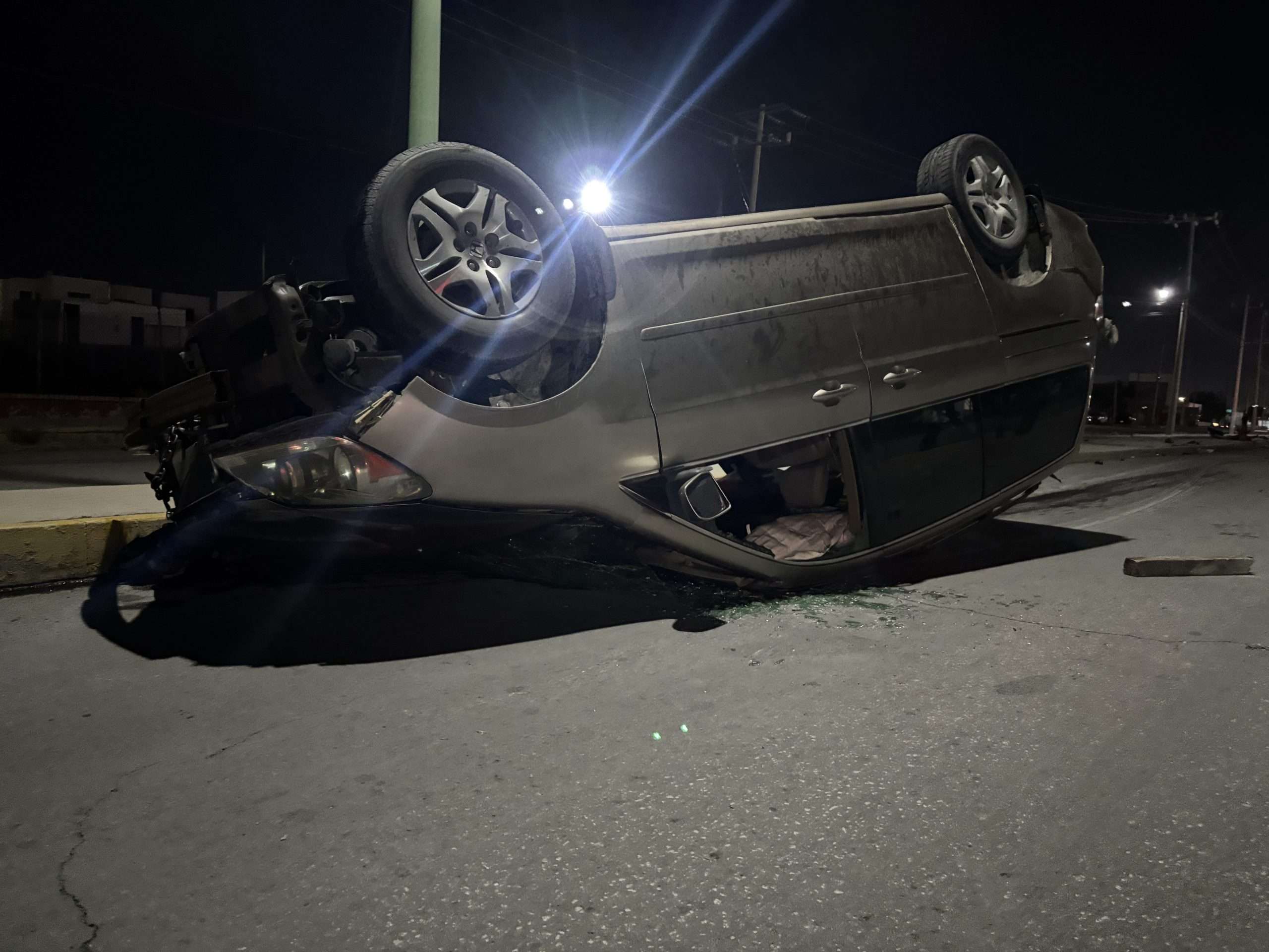 Como consecuencia, el vehículo Honda Odyssey chocó contra un objeto fijo, saliendo proyectado hacia una banqueta antes de realizar un segundo impacto. Esto generó una serie de giros que culminaron con la volcadura total del automóvil.