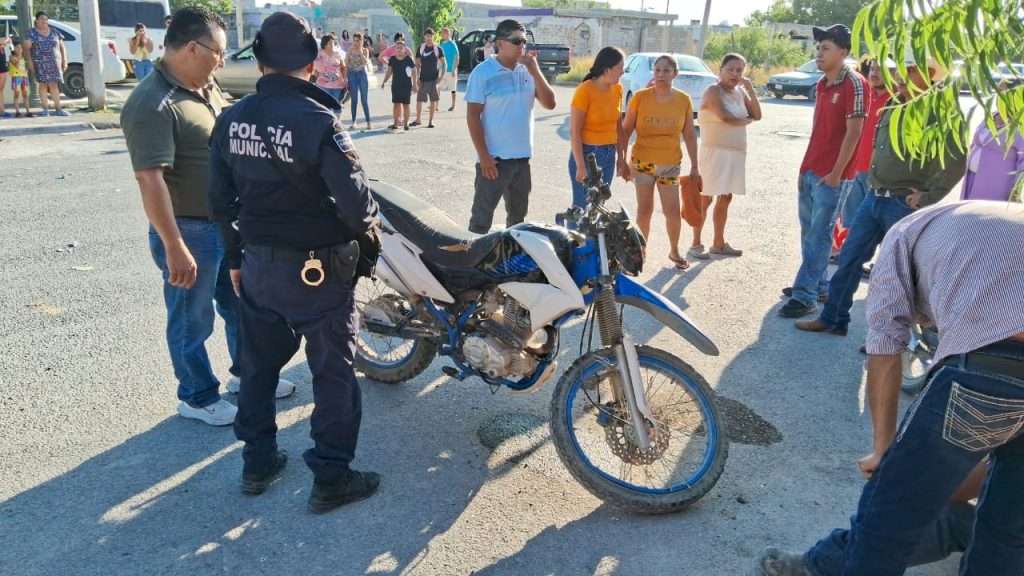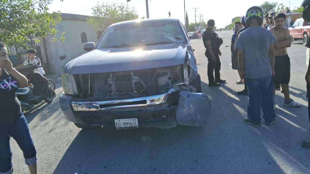 Minutos después de las 17:30 horas en el cruce de las calles Lázaro Cárdenas y San Luis, donde una moto fue embestida por una camioneta.