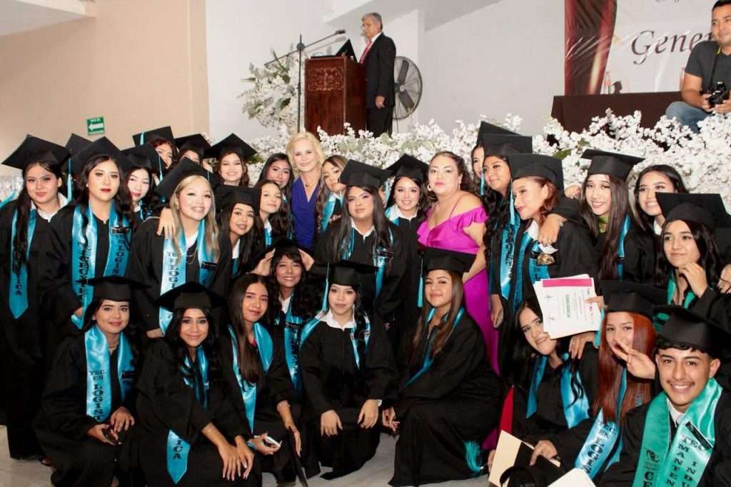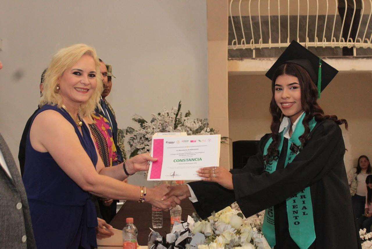 La alcaldesa de Múzquiz, Laura Jiménez Gutiérrez, asistió como madrina de generación a la ceremonia de graduación del CECyTEC “General Álvaro Obregón”, celebrada en la Villa de Palau, donde más de 200 jóvenes culminaron sus estudios en las distintas carreras técnicas que ofrece esta institución.