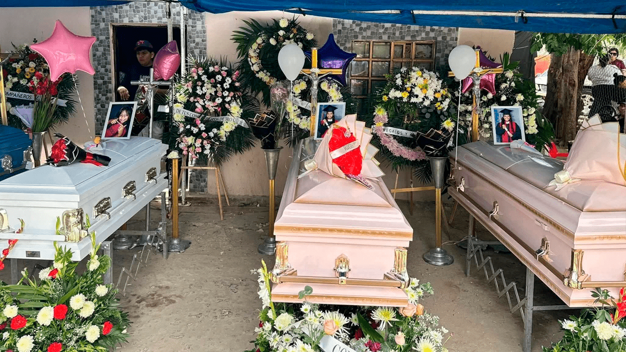 Las hermanas Meredith y Medelin, de 11 años, descansan en ataúdes color rosa. Este miércoles tenían previsto asistir a su ceremonia de graduación de primaria. A su lado se encuentra Karla, de nueve años, en un féretro blanco. En otro ataúd, de color azul, fue colocada su madre, Margarita, de 28 años. La familia pidió privacidad en este momento tan difícil, aunque personas ajenas a la familia acudieron a ofrecer sus condolencias.