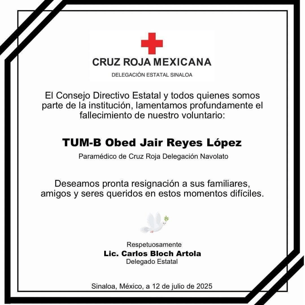 Obed Yair vivía en la cabecera municipal de Navolato y formaba parte activa del equipo de Cruz Roja en esa localidad. La Delegación en Navolato expresó su pesar por el fallecimiento del joven, destacando su calidad humana y compromiso con el servicio. En redes sociales, publicaron mensajes de despedida y reconocimiento a su labor como socorrista.
