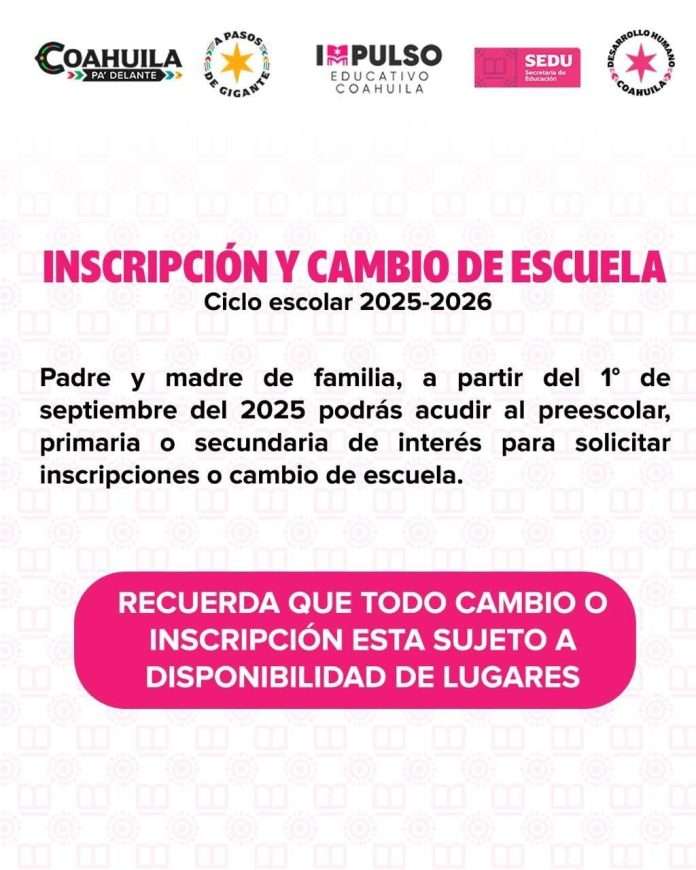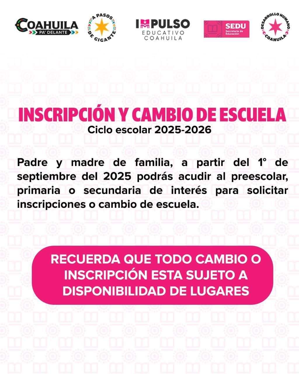 A partir del 1 de septiembre de 2025, padres y madres de familia en Monclova y la Región Centro podrán acudir al preescolar, primaria o secundaria de su interés para solicitar inscripción o cambio de escuelacorrespondiente al ciclo escolar 2025-2026.