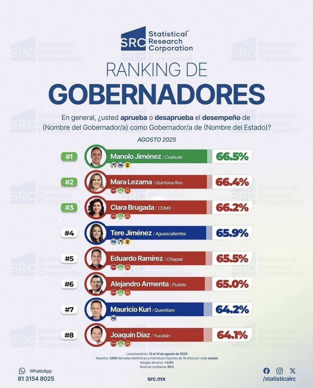 El gobernador de Coahuila, Manolo Jiménez Salinas, resultó el mejor evaluado en el Ranking de Gobernadores que presenta la casa encuestadora Statistical Research Corporation.