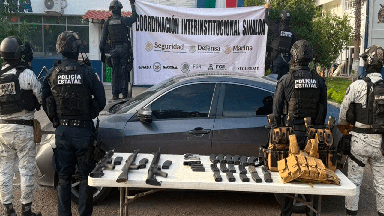 -En Culiacán, en el fraccionamiento Urbivilla del Roble, elementos de GN, Ejército Mexicano, SSPC y Policía Estatal aseguraron tres armas largas, dos armas cortas, 20 cargadores, 579 cartuchos, tres chalecos tácticos, seis placas balísticas y un vehículo.
