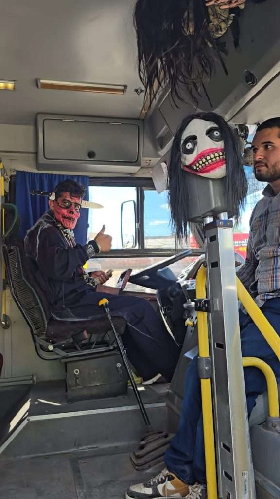 La unidad luce decoraciones por dentro y por fuera, con calabazas, telarañas, esqueletos y todo tipo de figuras aterradoras. Pero eso no es todo, en el interior suena una grabación con gritos y risas fantasmales, lo que convierte cada viaje en una auténtica aventura de miedo.