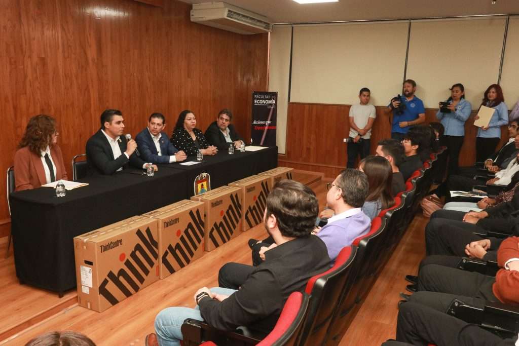 Por su parte, el director Jonathan Flores Pérez resaltó que este capítulo representa una oportunidad única para que las y los estudiantes establezcan vínculos directos con el gremio económico. Agradeció además al rector por la entrega del equipo de cómputo, señalando que la Facultad no había recibido una renovación tecnológica en 17 años.