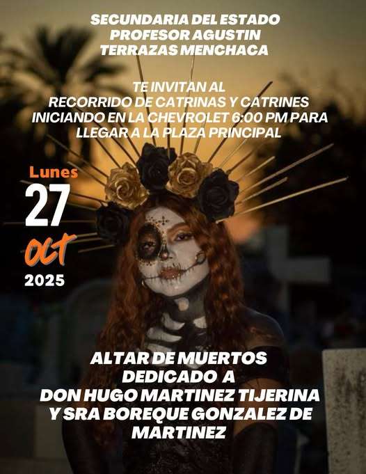 La Secundaria del Estado Profesor Agustín Terrazas Menchaca invita a toda la comunidad a participar en su celebración del Día de Muertos este lunes 27 de octubre a las 6:00 p.m., un evento que busca mantener vivas las tradiciones mexicanas.El festejo contará con la participación de alumnado, personal docente, autoridades educativas y municipales, así como del público en general.