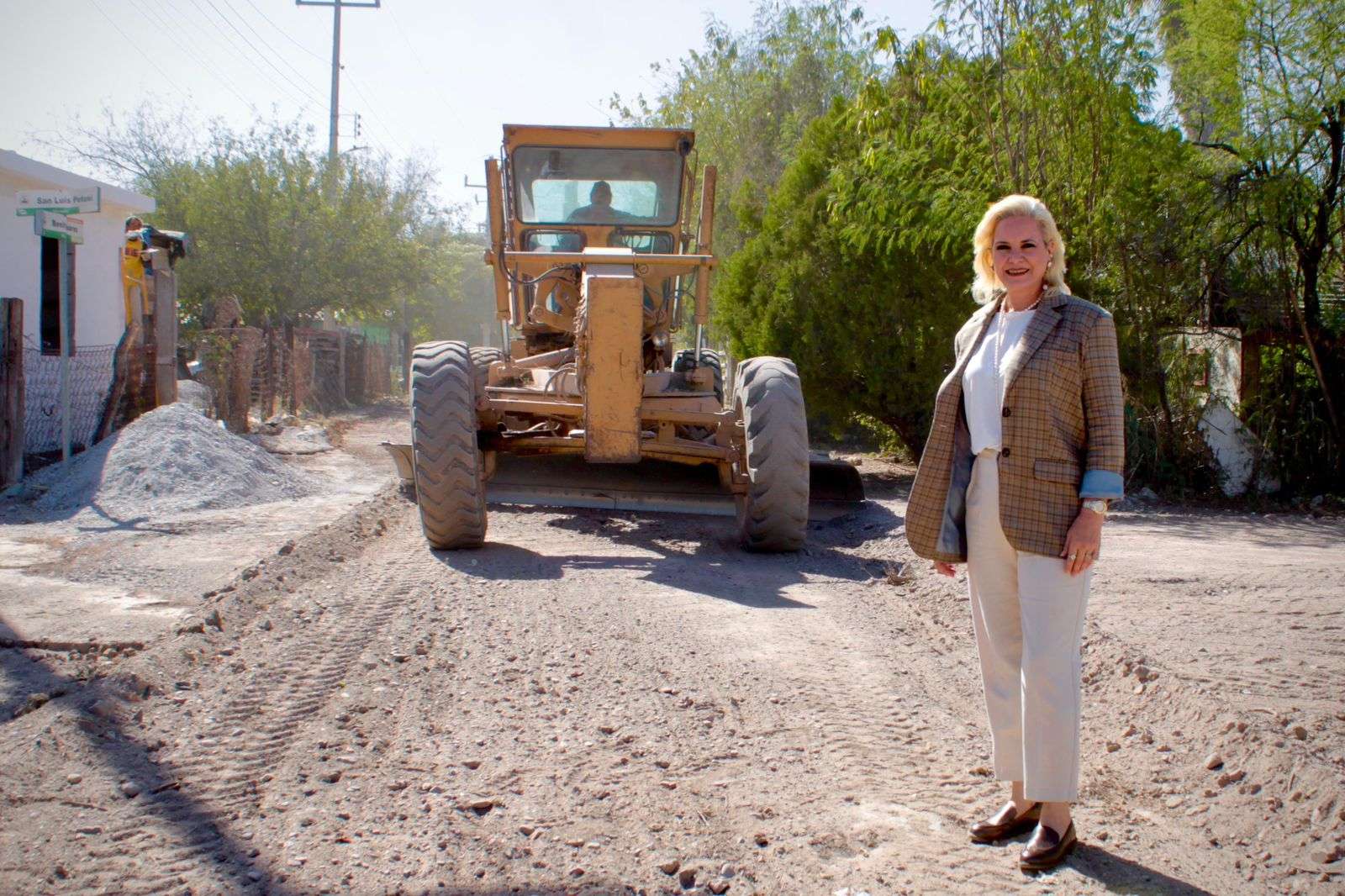La alcaldesa Laura Jiménez Gutiérrez acudió al mineral de Rancherías para supervisar los trabajos de colocación de tierra colorada y raspado de calles, realizados en atención a las solicitudes de las y los habitantes de la comunidad, con el propósito de mejorar la movilidad y el bienestar de las familias.