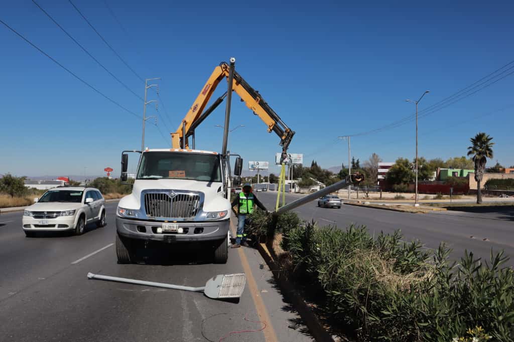 Sumado a esto y para incrementar la seguridad vial de los miles de personas que transitan por el bulevar Emilio Arizpe de la Maza, personal de la Dirección de Servicios Públicos de Saltillo trabajó en el retiro y posterior reinstalación de un poste y su luminaria, dañada por un accidente automovilístico en el lugar.