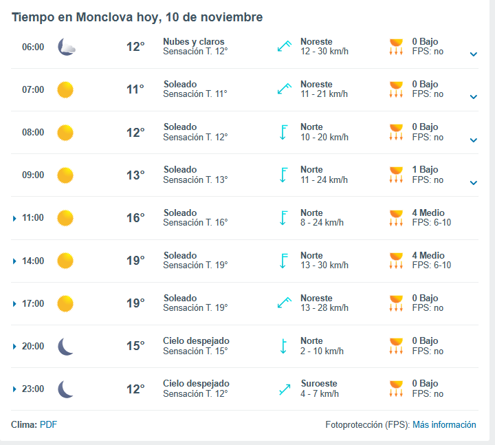 Este lunes 10 de noviembre, Monclova amaneció con temperaturas frescas y cielo mayormente despejado. Desde las primeras horas del día, el termómetro marcó alrededor de 12 grados Celsius, con una sensación térmica similar, bajo un ambiente tranquilo y viento del noreste.