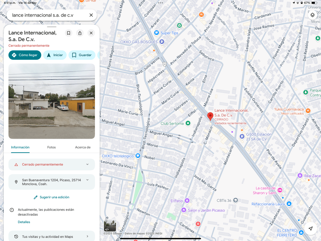 La supuesta empresa coahuilenses que pretende comprar Altos Hornos de México (AHMSA), Lance Internacional S.A. de C.V. está, según el buscador de internet Google “cerrada permanentemente” sin precisar fecha, e indica que fueron visitados recientemente por Google Maps, que constató que está cerrada.