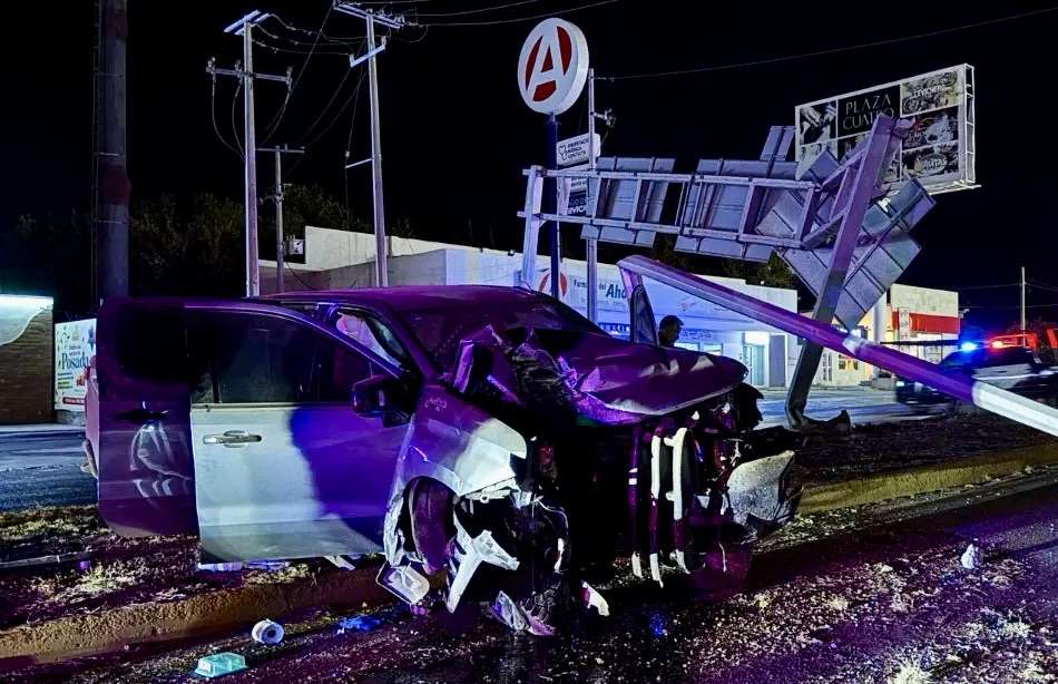 Saltillo.- Un fuerte accidente automovilístico registrado la madrugada de este sábado provocó severos daños en la infraestructura vial del sur de Saltillo, luego de que el conductor de una camioneta perdiera el control y se estrellara contra un señalamiento metálico en plena vía rápida.