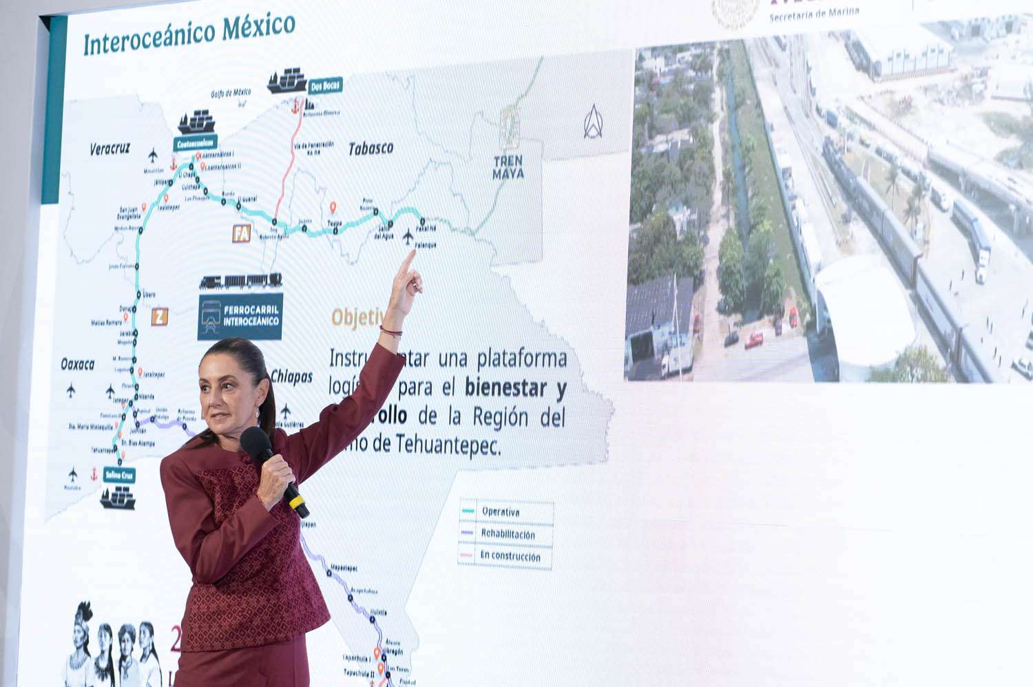 Recordó que el expresidente Andrés Manuel López Obrador inauguró el tramo que recorre Coatzacoalcos hasta Palenque, donde se une el Tren Interoceánico con el Tren Maya y llegar a Mérida, Yucatán. Además, explicó que se interviene el Puerto Chiapas, donde ya pasan vehículos y el de Salina Cruz.