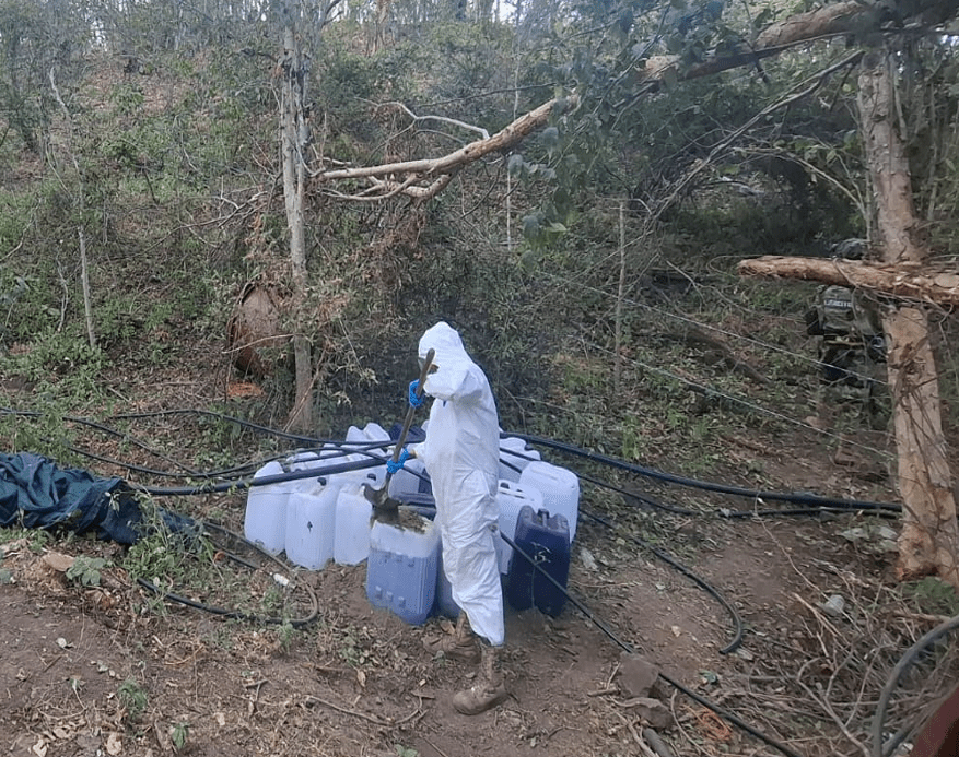 -En Culiacán y Cosalá, Sinaloa, elementos del Ejército Mexicano localizaron e inhabilitaron dos laboratorios clandestinos y 18 áreas de concentración de material diverso, 19,575 litros y 1,125 kilos de sustancias para la elaboración de metanfetamina, dos reactores de síntesis orgánica y cinco condensadores.