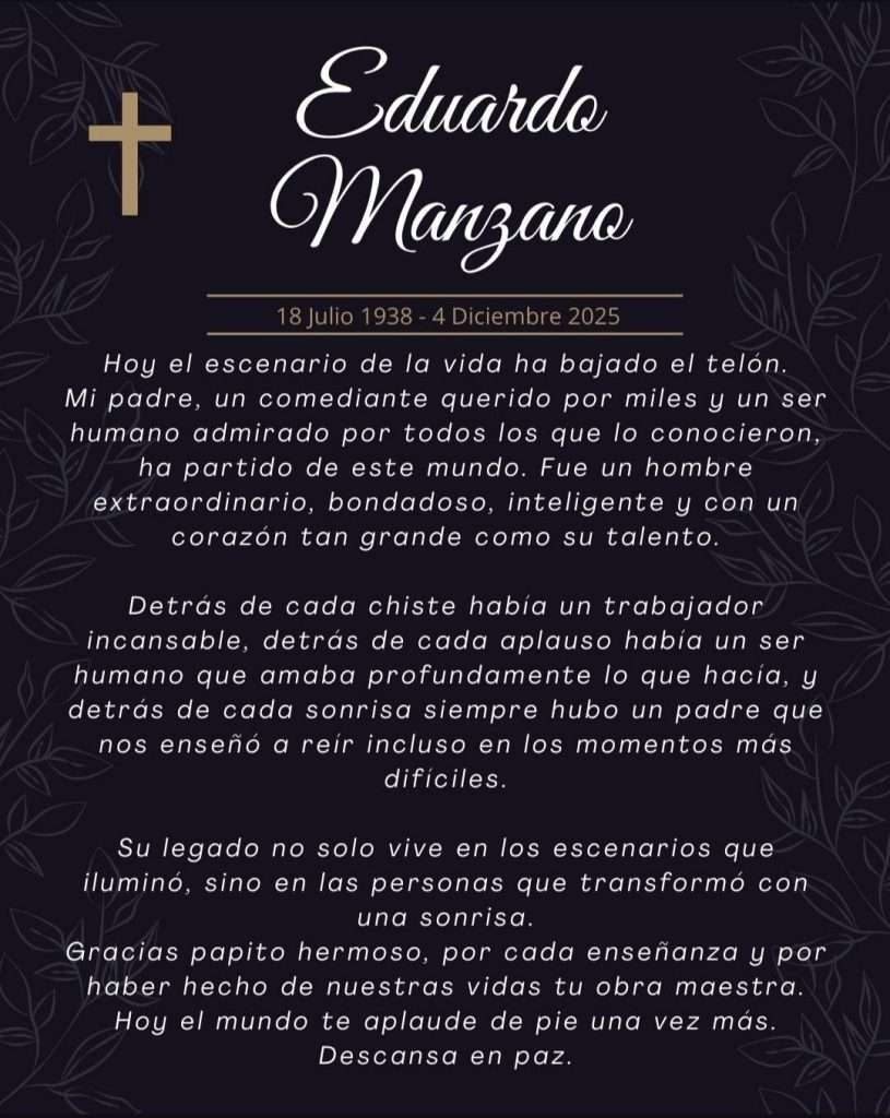El comediante mexicano Eduardo Manzano, reconocido por su trabajo en Los Polivoces y por interpretar al Abuelo Arnoldo en Una Familia de Diez, falleció el 4 de diciembre a los 87 años. La noticia fue confirmada mediante un mensaje publicado en las redes sociales del actor, donde su familia agradeció las muestras de cariño que han recibido desde el anuncio.