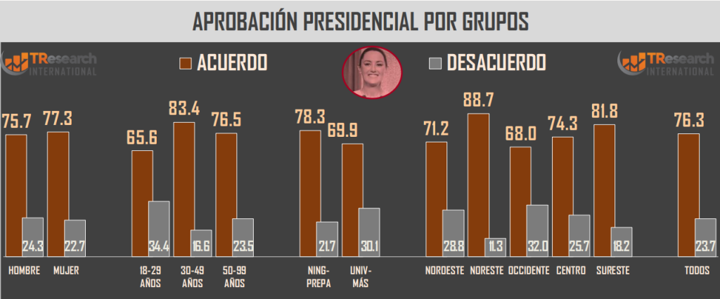 El análisis por género muestra niveles similares de respaldo, con 77 por ciento de aprobación entre mujeres y 76 por ciento entre hombres. En cuanto a grupos de edad, el mayor apoyo se concentra en personas de entre 30 y 49 años, donde la aprobación alcanza 83 por ciento, siendo el segmento con mejor percepción del gobierno federal.