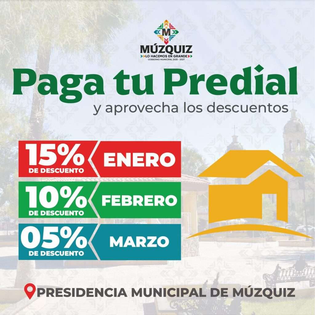 El Gobierno Municipal de Múzquiz exhorta a la ciudadanía a cumplir con el pago del impuesto predial, una contribución fundamental para continuar impulsando obras, servicios públicos y acciones que mejoran la calidad de vida de las familias del municipio.