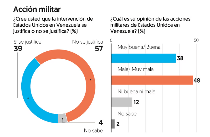 Al profundizar en la percepción general sobre estas acciones, la encuesta revela opiniones mayoritariamente críticas. El 48 por ciento expresó una opinión negativa sobre la operación militar en Venezuela.