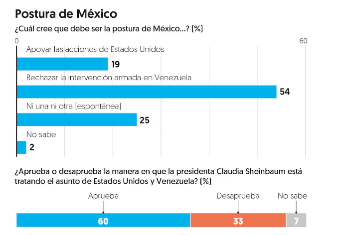 Una encuesta nacional realizada por El Financiero muestra que la mayoría de la población mexicana no respalda la intervención militar de Estados Unidos en Venezuela. El sondeo se levantó después de que se informara sobre la captura de Nicolás Maduro.