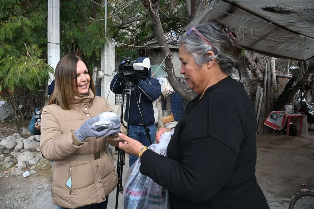 Las acciones se concentraron en las colonias San Cristóbal y Morelos, donde Sari Pérez Cantú, acompañada por Karen Cadena, directora del DIF Frontera, entregó alimentos, bebidas calientes y colchas.