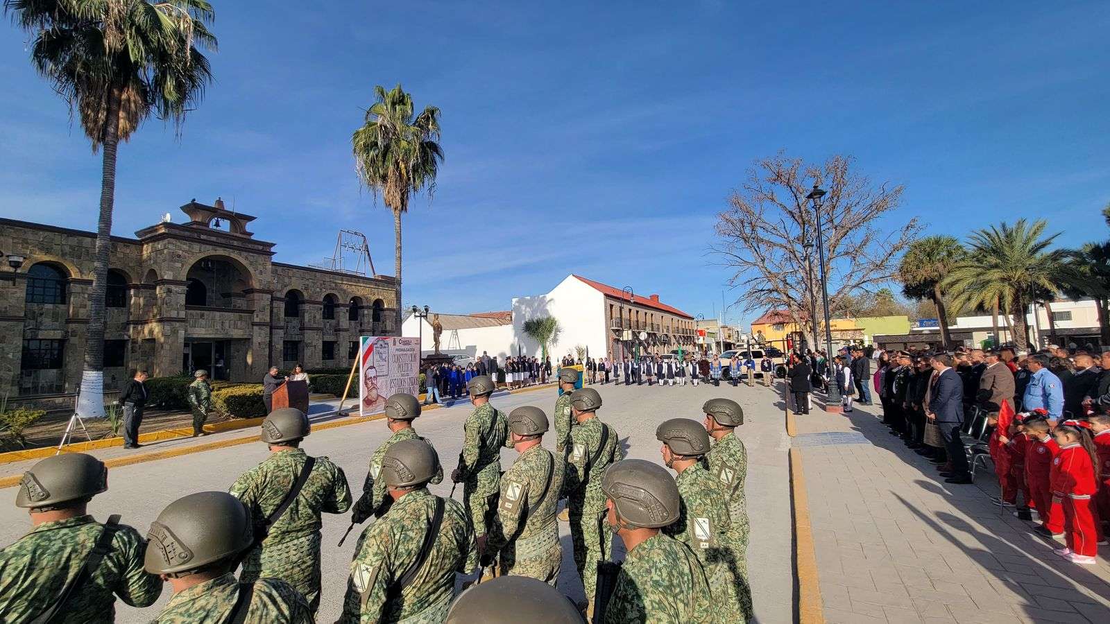 En representación de la Presidenta Municipal, Laura Jiménez Gutiérrez, acudió el Secretario del Ayuntamiento, José Manuel Flores Múzquiz. Estuvo acompañado por el Coronel de Caballería D.E.M. Hugo Horacio Verdeja Salcedo, Comandante del 14° Regimiento de Caballería. Además, el regidor Luis Mondragón Santos fue el encargado del discurso oficial.