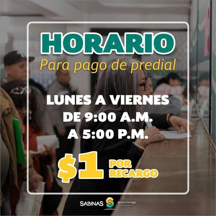 El Gobierno Municipal de Sabinas que encabeza el alcalde, José Feliciano “Chano” Díaz Iribarren invita a la ciudadanía a aprovechar las facilidades para ponerse al corriente en el pago del impuesto predial.