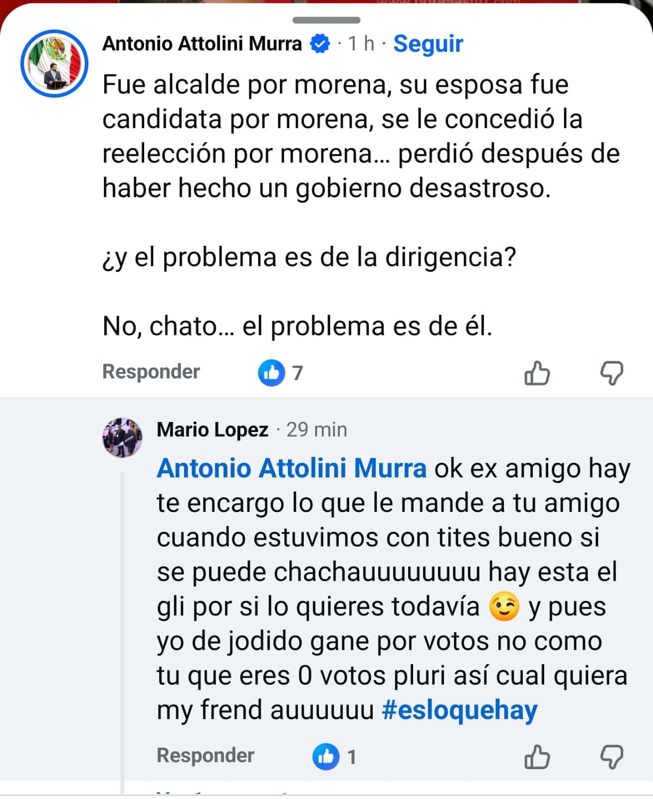 La respuesta no tardó. Mario López replicó cuestionando la legitimidad política del diputado, al señalar que él ha obtenido cargos mediante el respaldo ciudadano en las urnas, mientras que Attolini llegó por la vía plurinominal y lo calificó como 0 VOTOS.