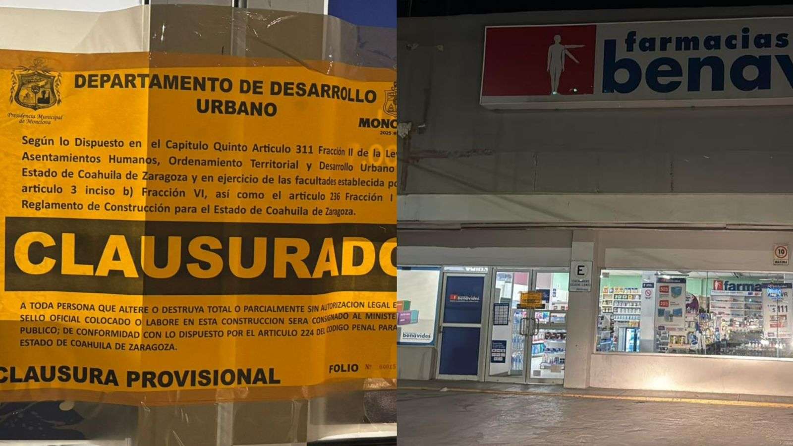 La dirección de Obras Públicas procedió a la clausura de una sucursal de Farmacia Benavides en Monclova, ubicada en la colonia El Pueblo, tras detectar que el establecimiento operaba sin la renovación de su documentación oficial obligatoria.