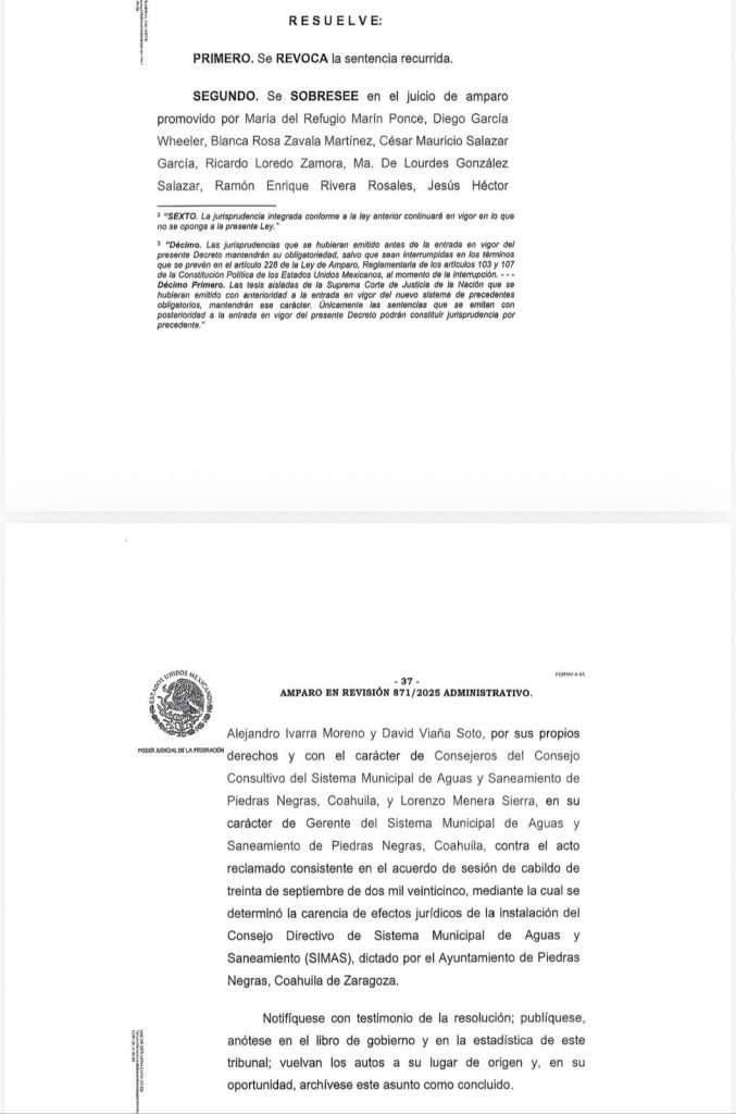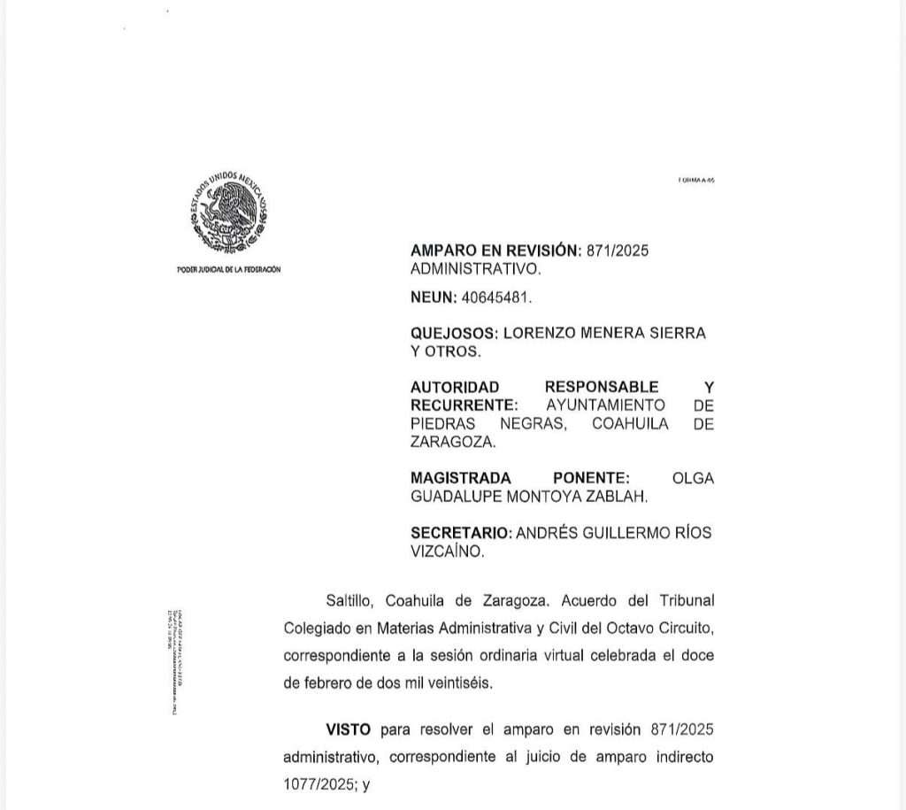 Este viernes fue notificada, mediante lista de acuerdos del Tribunal Colegiado en Materia Administrativa y Civil del Octavo Circuito, la sentencia dictada en el Amparo en Revisión 871/2025, mediante la cual se revocó la sentencia de amparo previamente concedida por el Juzgado Tercero de Distrito en Piedras Negras, Coahuila dentro del Juicio de Amparo 1077/2025.
