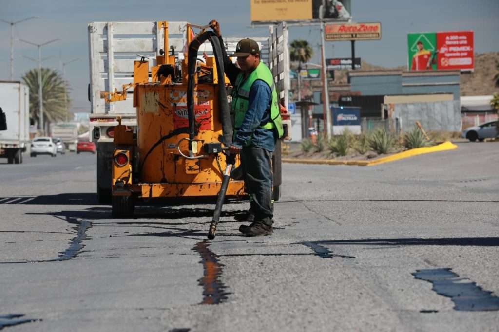 En esta transitada vialidad, el Gobierno Municipal realizó el sellado de grietas del asfalto como parte del mantenimiento preventivo y correctivo en las vialidades principales, lo que prolonga la vida útil del pavimento.