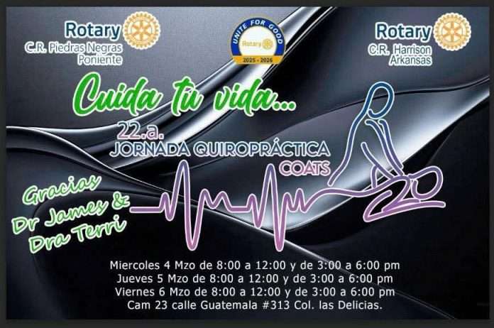 El presidente del Club Rotario, Sergio Cabello, anunció el arranque de una nueva jornada de atención quiropráctica gratuita para la comunidad, actividad que forma parte de los programas sociales que la organización impulsa en beneficio de los habitantes de Piedras Negras.