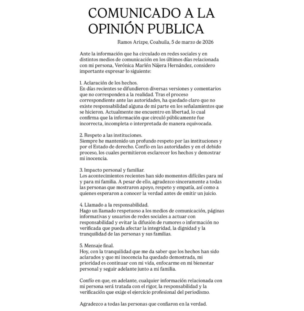 A través de un mensaje compartido este 9 de marzo, la mujer cuya identidad se mantuvo bajo reserva aseguró que las acusaciones vertidas en su contra carecen de fundamento legal y que, a diferencia de lo que se especuló en plataformas digitales, no enfrenta un proceso de detención. “Me encuentro en libertad y en mi domicilio”, se enfatizó durante su intervención.