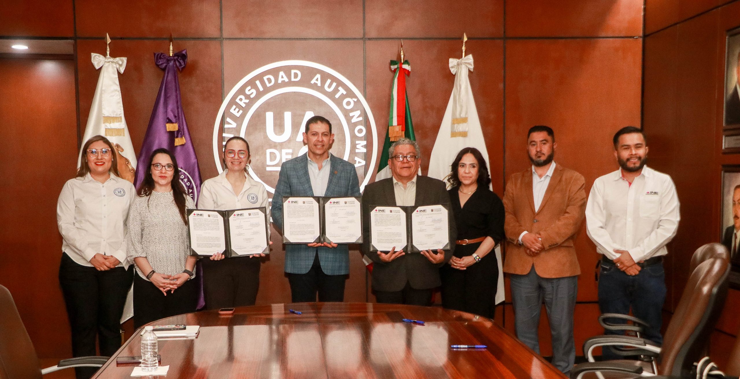 En la Sala de Juntas del Despacho de Rectoría, el documento fue firmado por el rector de la máxima casa de estudios, Octavio Pimentel Martínez , y el consejero presidente del Consejo Local del INE en Coahuila, Miguel Castillo Morales . Como testigos de este acto estuvieron presentes autoridades universitarias y vocales ejecutivos de las juntas distritales del INE.