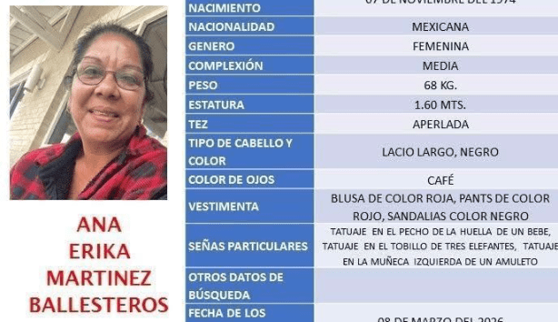 La Fiscalía General del Estado activó el Protocolo Alba para localizar a Ana Erika Martínez Ballesteros, mujer de 52 años reportada como desaparecida en Monclova, Coahuila. De acuerdo con la ficha de búsqueda emitida por la Fiscalía de Personas Desaparecidas de la Región Centro, la mujer fue vista por última vez el 8 de marzo de 2026 y su ausencia fue reportada oficialmente un día después, por lo que se solicitó la colaboración de la ciudadanía para ubicar su paradero.