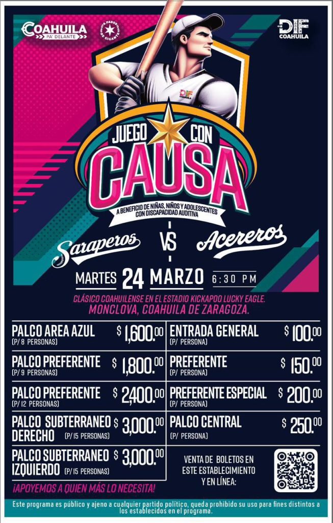 Autoridades del DIF Coahuila en la Región Centro reiteraron la invitación a la ciudadanía para asistir al juego con causa entre los Acereros de Monclova y los Saraperos de Saltillo, evento que se realizará el 24 de marzo a las 6:30 de la tarde en el estadio Kickapoo Lucky Eagle.