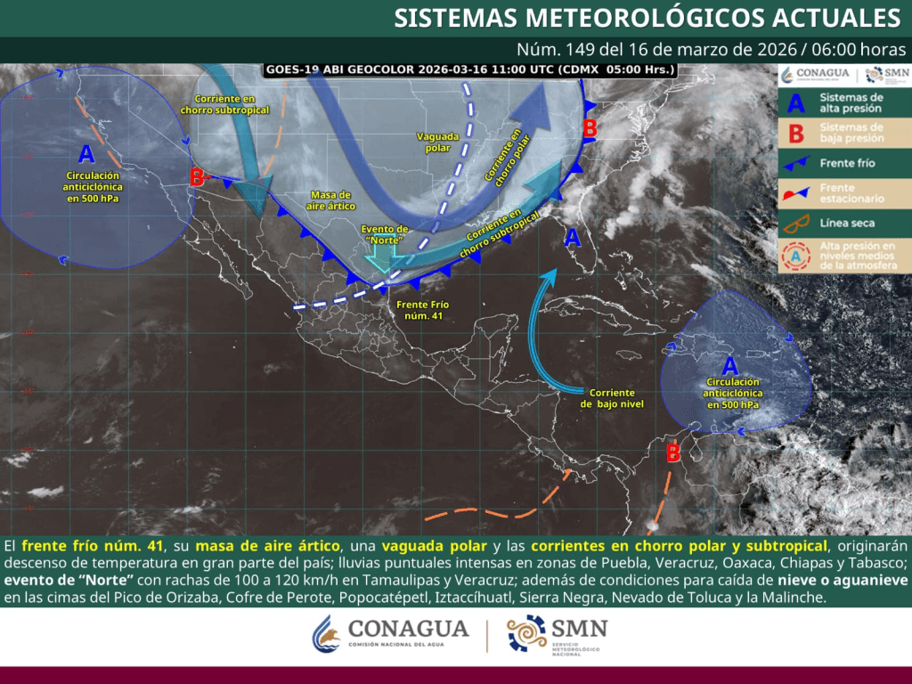 La Secretaría de Gobierno, a través de la Subsecretaría de Protección Civil del Estado, informa que el frente frío número 41, en interacción con su masa de aire ártico, se desplazará rápidamente sobre la vertiente del Golfo de México.