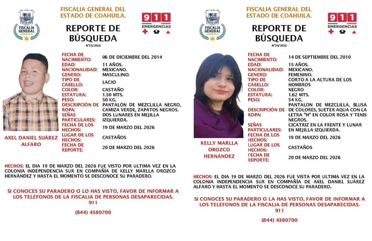 Las autoridades mantienen inspecciones rigurosas con el objetivo de localizar a Kelly Marlla Orozco Hernández, de 15 años, y Axel Daniel Suárez Alfaro, de 11 años. Ambos menores desaparecidos en Castaños no han sido vistos desde el pasado 19 de marzo.