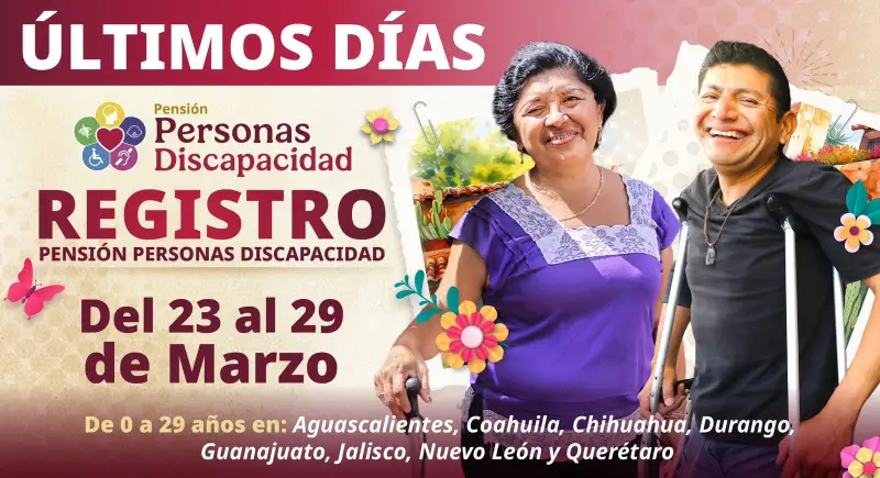 La Secretaría de Bienestar informa que son los últimos días de registro para la Pensión para el Bienestar de las Personas con Discapacidad, proceso que concluye el próximo domingo 29 de marzo. El Lic. Américo Villarreal Santiago, Delegado de Bienestar en Coahuila, invitó a la población a acudir al Módulo de Registro más cercano para recibir este derecho consagrado en el artículo 4 de la Constitución mexicana.
