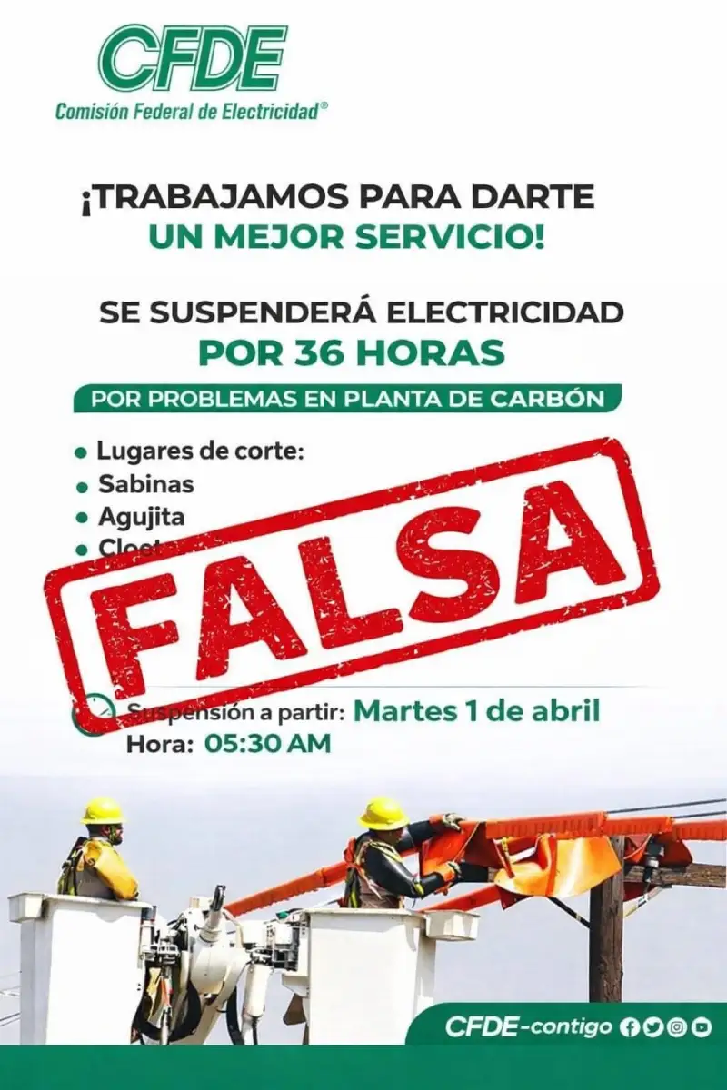 El director de Protección Civil de Sabinas, Sebastián Jaime Arellano, informó que no existe ninguna suspensión programada del servicio de energía eléctrica en la región, como se ha difundido recientemente en redes sociales.