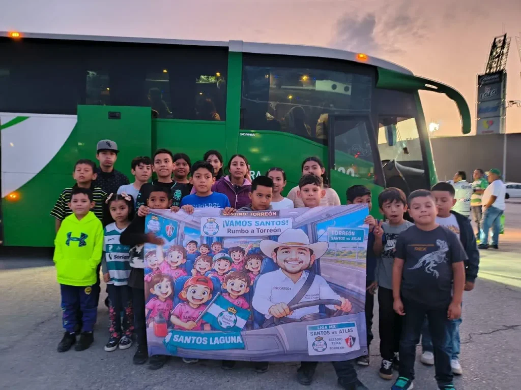 Progreso, Coahuila.– Un grupo de niños del equipo Fútbol Santos Club de Progreso vivió una experiencia inolvidable al viajar a la ciudad de Torreón para presenciar el encuentro entre Santos Laguna y Atlas FC, gracias al apoyo brindado por la administración municipal.