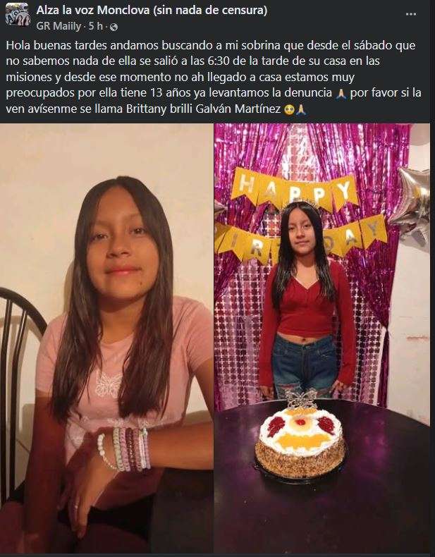 La angustia crece en la región centro de Coahuila tras el reporte de Brittany desaparecida en Monclova, una menor de apenas 13 años de edad que fue vista por última vez el pasado sábado por la tarde en la colonia de Las Misiones. Sus familiares han solicitado el apoyo de la ciudadanía para dar con su paradero.